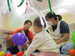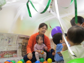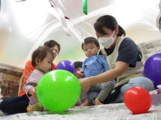 実はこれ、新聞紙とビニール袋で作ったテントです。扇風機で空気を送り込んで膨らませています。区切られた空間は落ち着くようで、泣く子はいませんでしたよ。扇風機の風で揺れるテープや風船の動きを楽しみました。