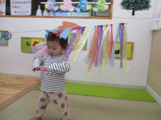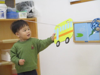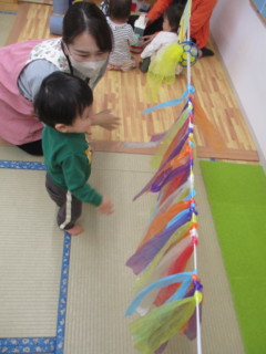 室内に張った紐にスズランテープやオーボール、バスの制作物を通しました。スズランテープの暖簾をくぐったり、揺れる様子を眺めたり、バスやボールを動かして遊びます。