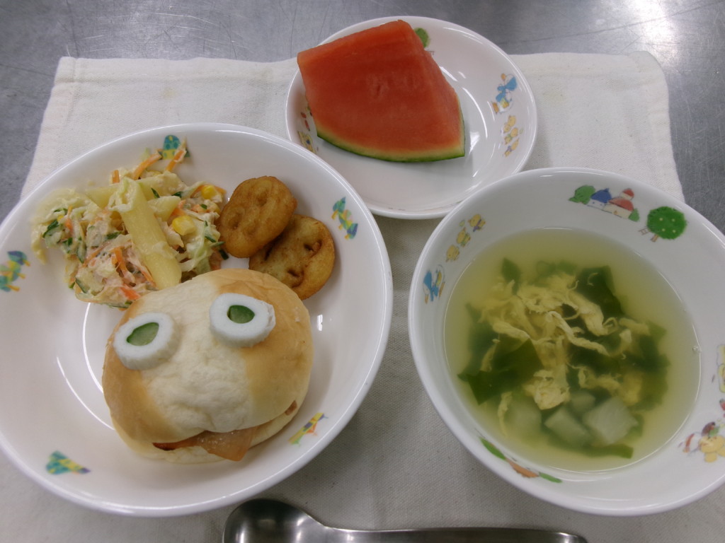 「照り焼きチキンバーガー ペンネサラダ ポテト わかめとたまごのスープ すいか」