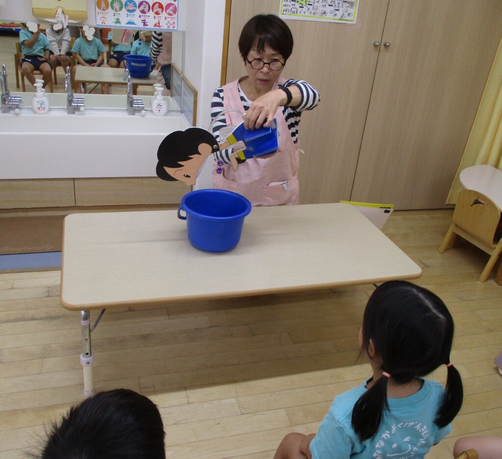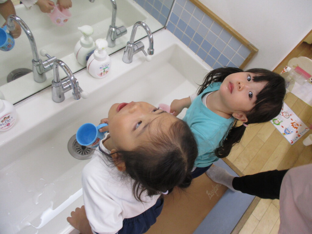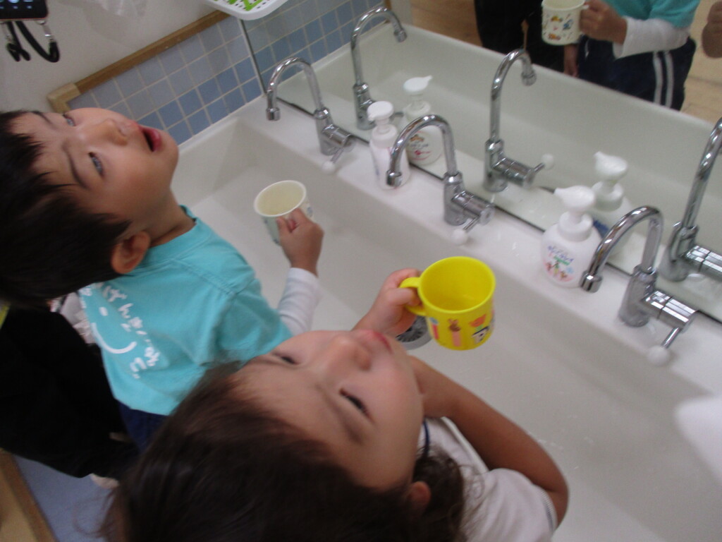 ガラガラうがいでは、喉のバイキンがお水と一緒に出るところを一緒に見てもらいました。