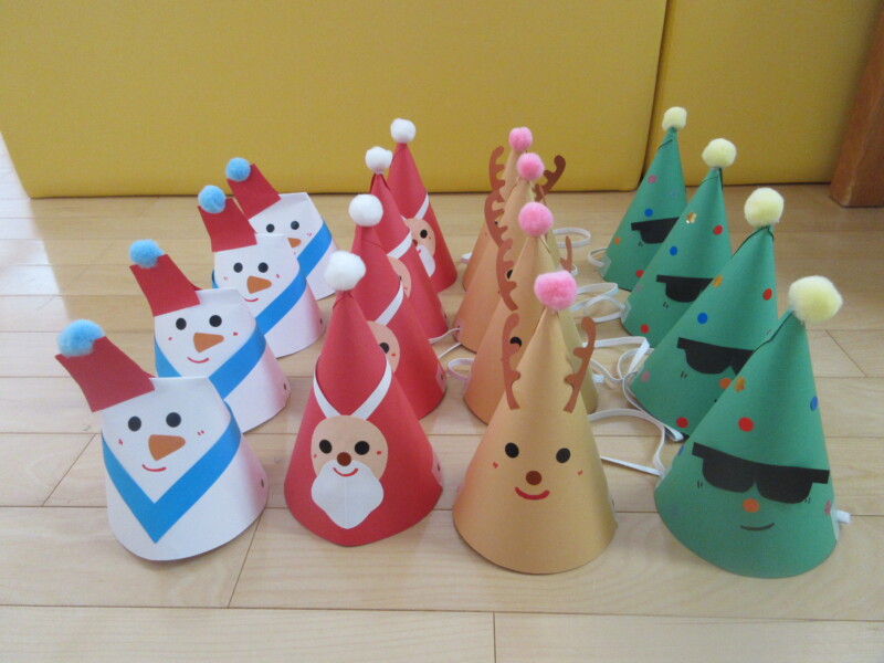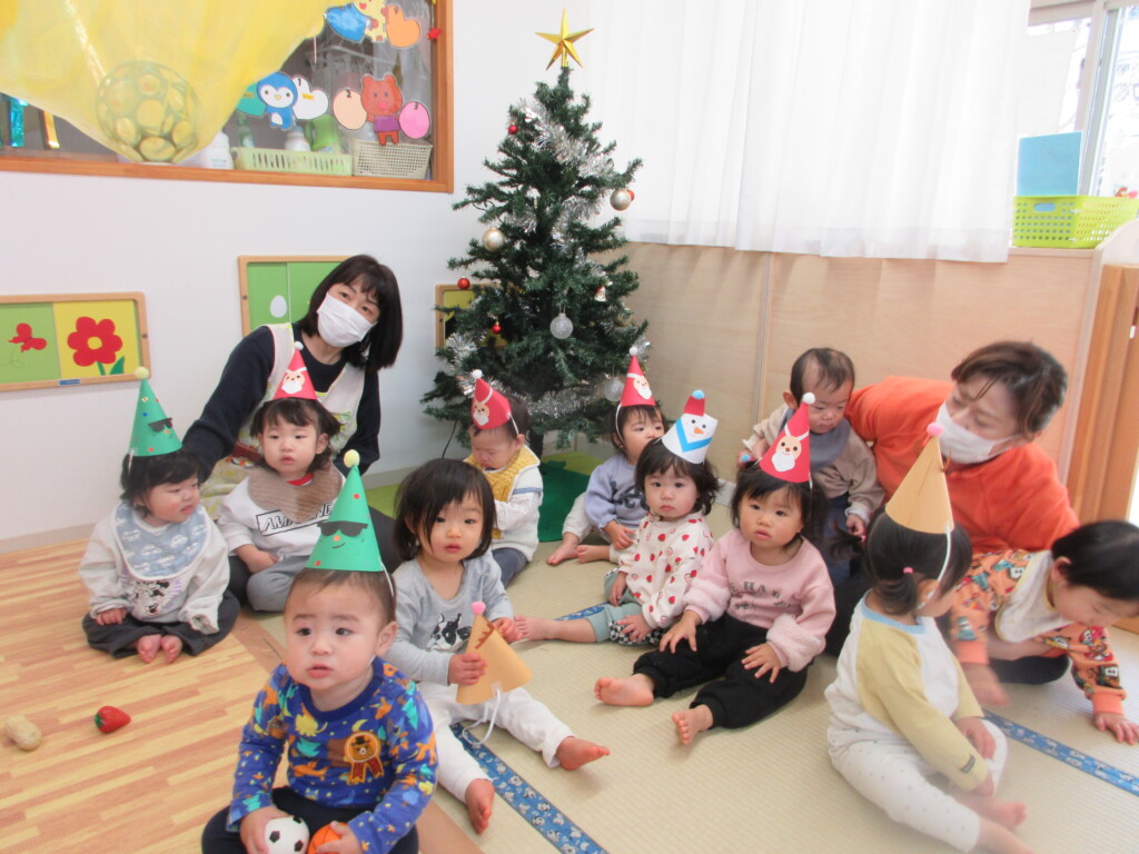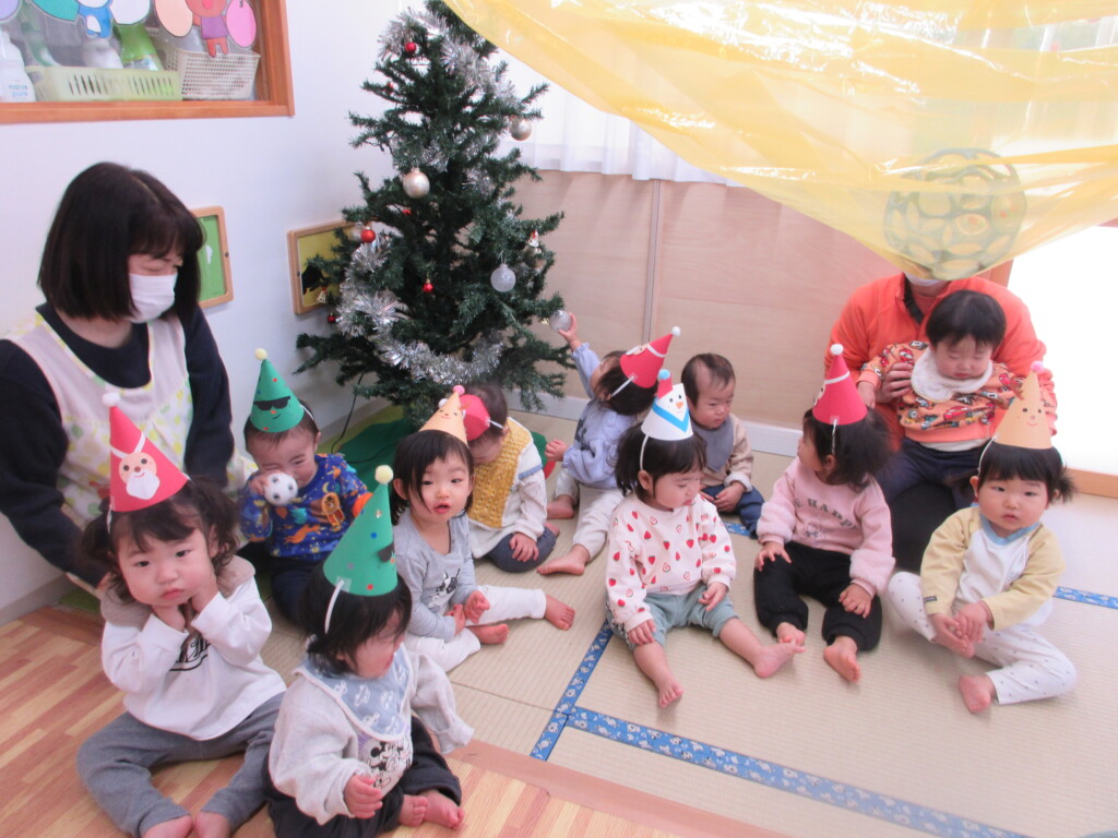 保育士が作ったクリスマス帽子をかぶって写真撮影。クリスマスツリーを見て「これはなんだ?」という反応。木についている飾りがキラキラしていて興味津々。帽子をかぶる子と帽子は嫌だ、ととってしまう子がいましたが、楽しいクリスマスになるといいな!