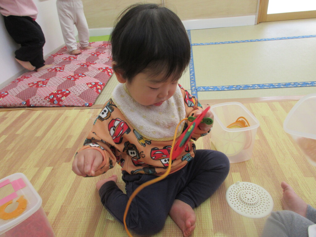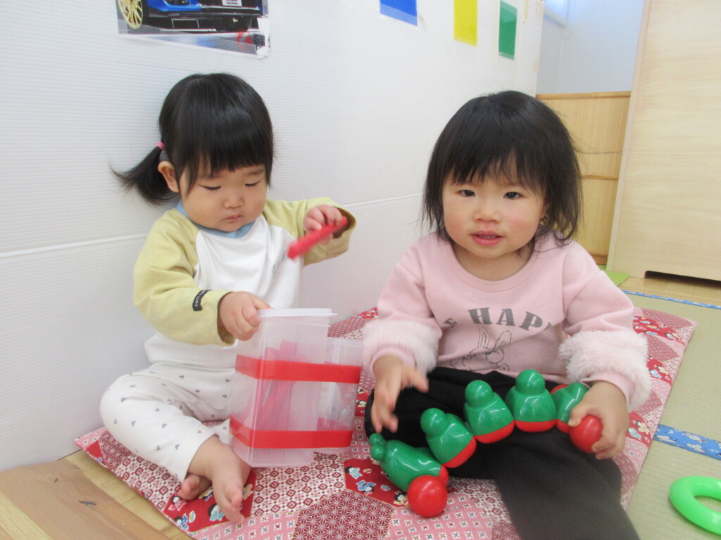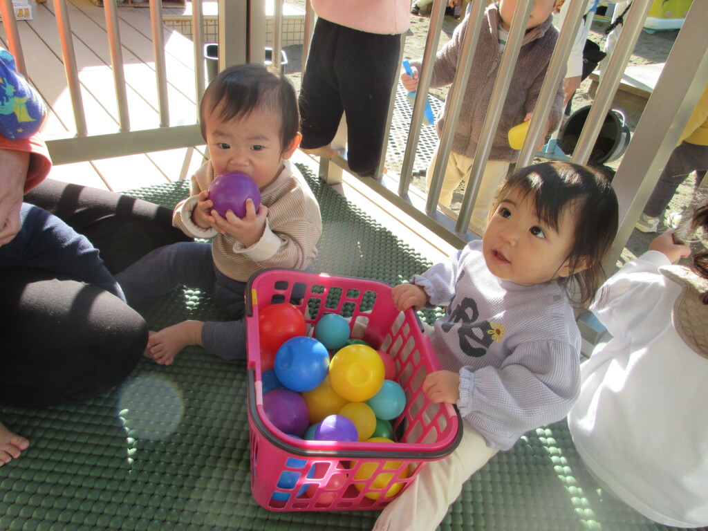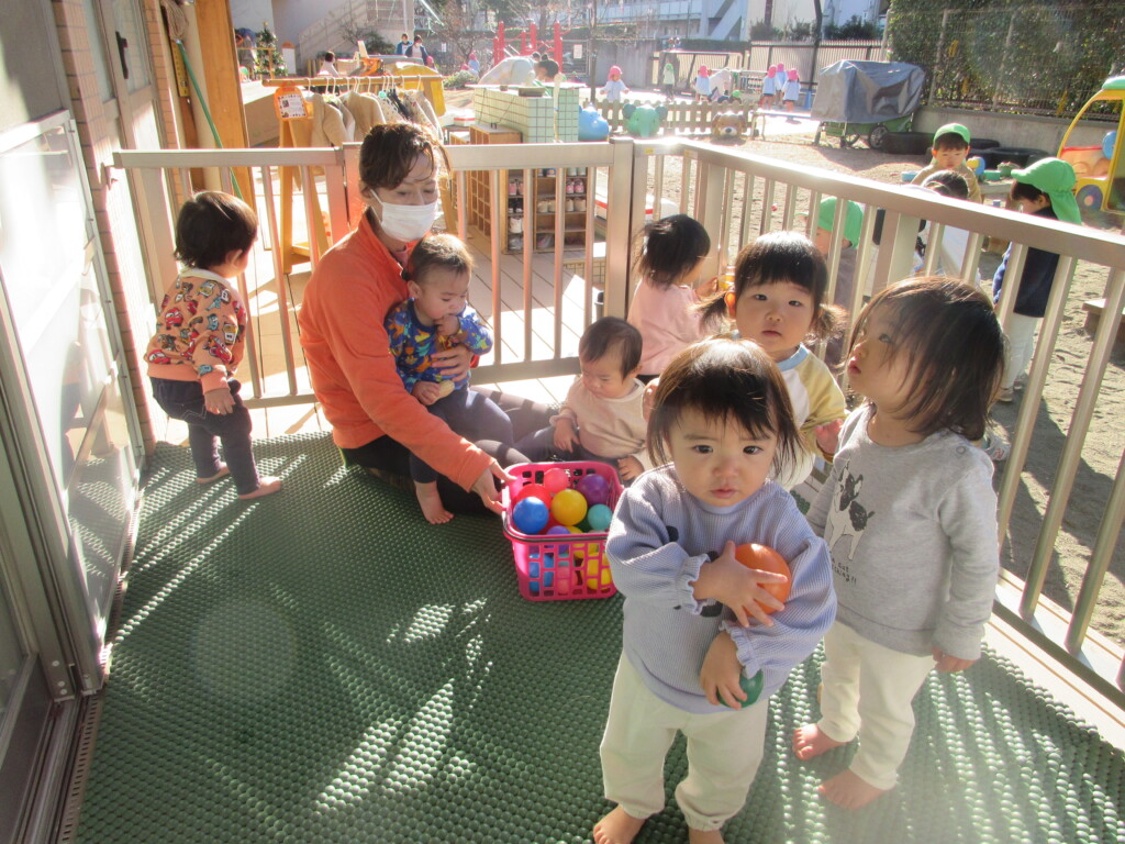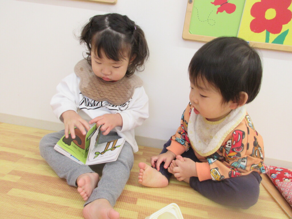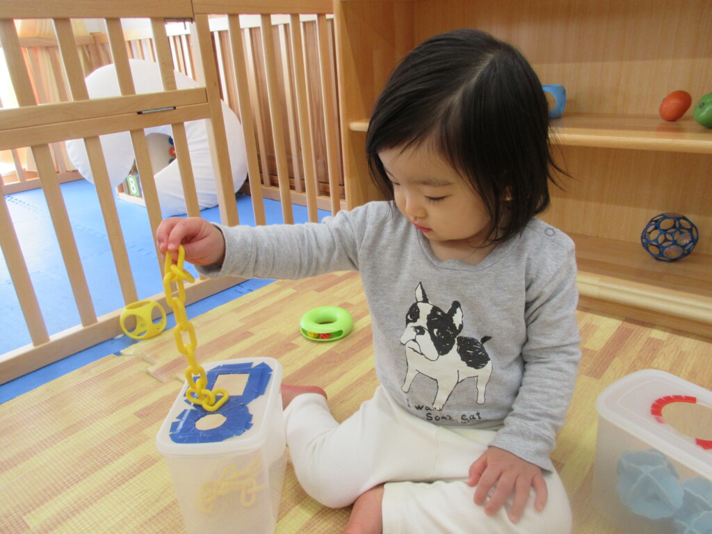 お天気の良い日はテラスでしゃぼん玉を見たり靴を履いて園庭をお散歩しています。室内では一人で集中してぽっとん落とし、ひも通し。友だちと遊ぶことも増えてきて、笑いあったりおしゃべりを楽しんでいます。絵本は『だるまさん』『もいもい』が大好きです。手遊び・歌遊びでは『つのつのつーの』『手をたたきましょう』で楽しんでいます。