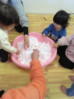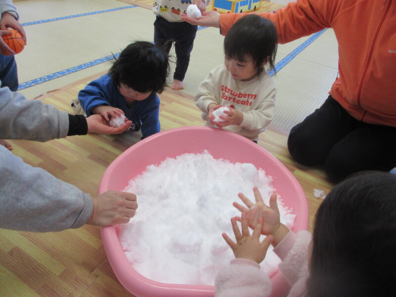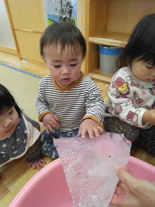 待ち遠しかった雪がやっと降って、初めて見る雪や氷に興味津々!触れた瞬間「あっ!つめたい‼」という心の声が聞こえてきました☆季節を五感で楽しめました。