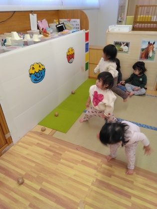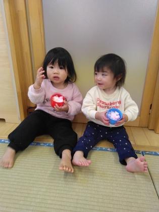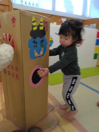 節分にちなんでお部屋で豆まき遊びをしました。ガムテープで丸めた豆を「エィッ!」と投げたり穴に入れてみたり…かわいい鬼なら怖がらず楽しめました。