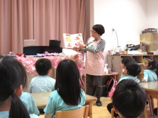 エプロンシアター「なんでも食べてげんきいっぱい」(食育エプロン メイト)を使って、